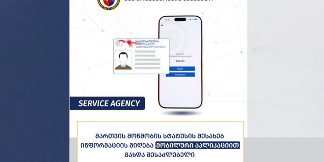 მომსახურების სააგენტოს აპლიკაციაში – Service Agency-ში რეგისტრირებულ პირებს აპლიკაციის განახლების შემდეგ უკვე შეუძლიათ, მიიღონ ინფორმაცია სატრანსპორტო საშუალების მართვის უფლების სტატუსის და მინიჭებული ქულების შესახებ, – ინფორმაციას მომსახურების სააგენტო ავრცელებს.